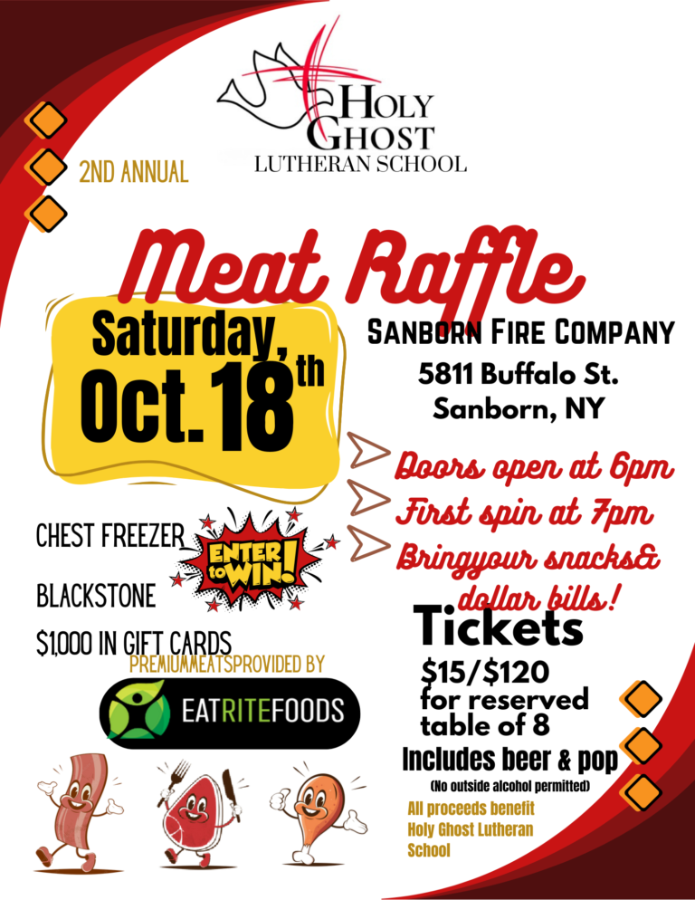 Bring your friends and family for a fun night! We will meet at Sanborn Fire Hall for fellowship, snacks, drinks, and lots of prizes. Doors open at 6pm and the first spin takes place at 7pm. Many thanks to our friends at Eat Right for helping to sponsor this event!